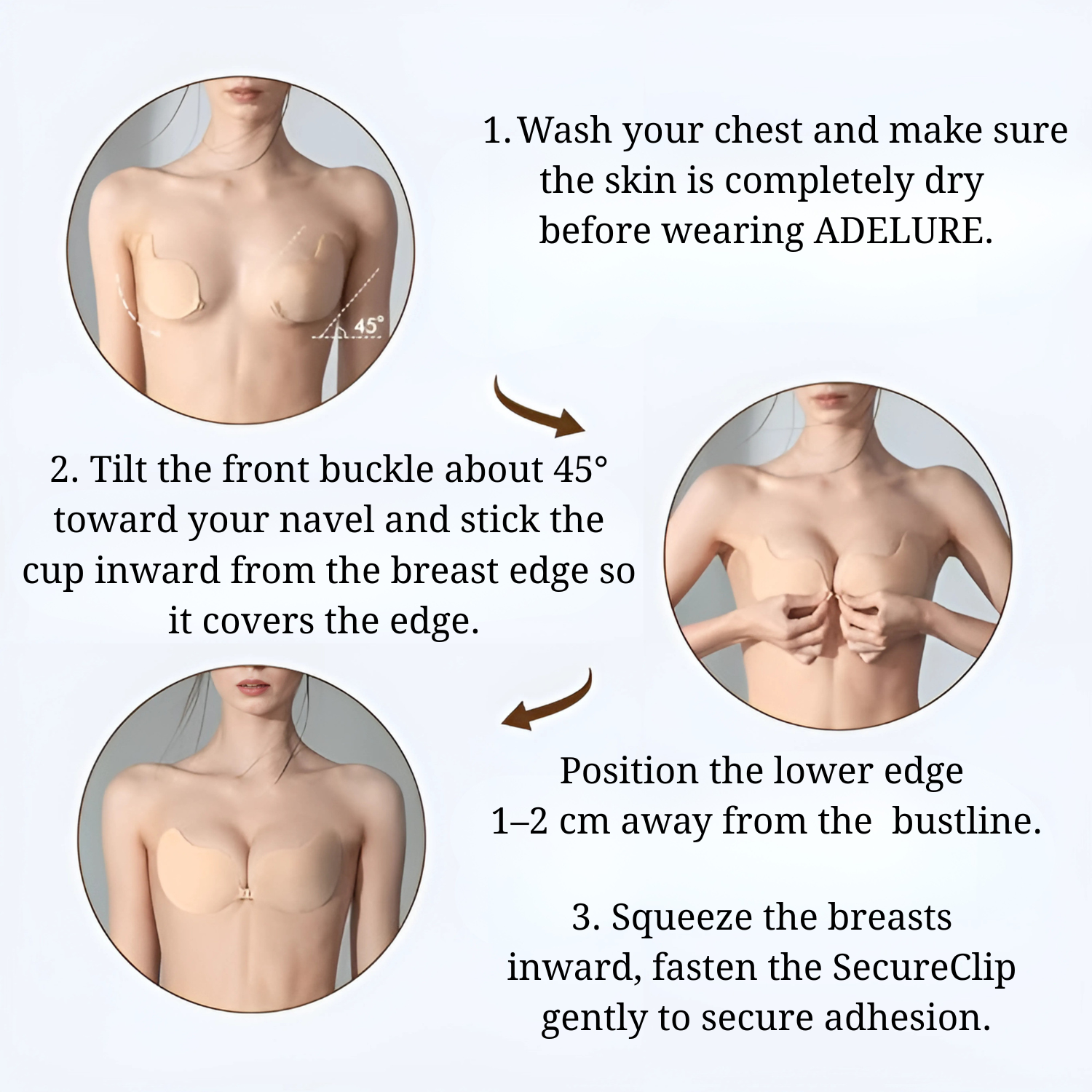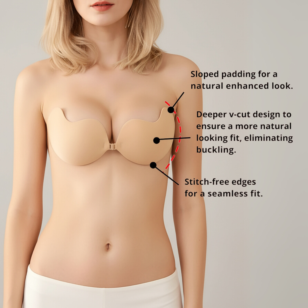 Engineered adhesive that resists heat and sweat, skin‑safe comfort, true support for fuller busts, and a Perfect‑Day Guarantee.